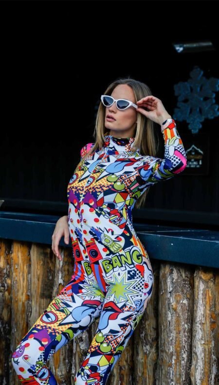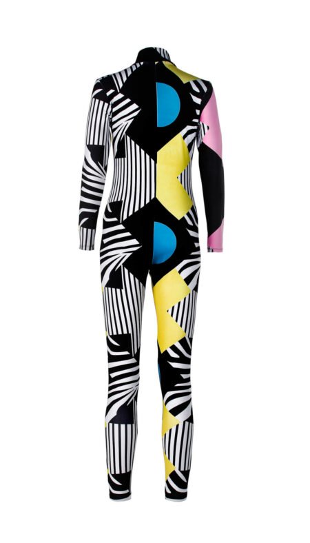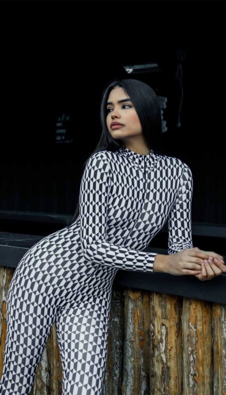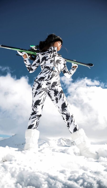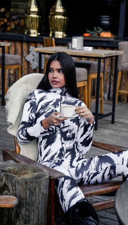 - 34 % Off895.00 $Original price was: 895.00 $.595.00 $Current price is: 595.00 $.Stand-up collar, waterproof covered metal zipper, black and white patterned ski suit