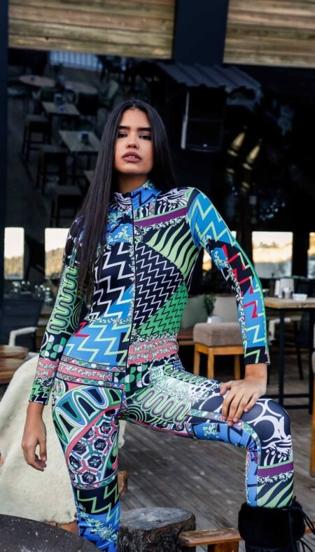 - 34 % Off895.00 $Original price was: 895.00 $.595.00 $Current price is: 595.00 $.Stand-up collar, waterproof covered metal zipper, design green blue patterned ski suit.
