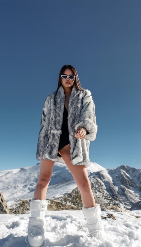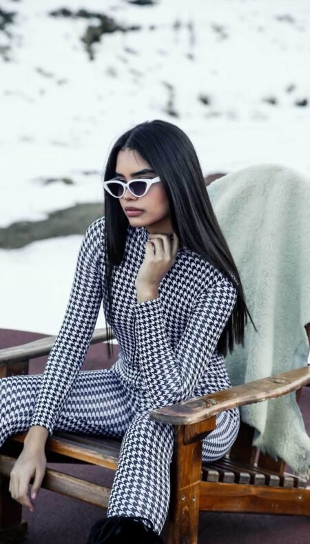 - 34 % Off895.00 $Original price was: 895.00 $.595.00 $Current price is: 595.00 $.Designer ski jacket with stand-up collar, waterproof lining, metal zipper with waterproof cover, black and white pattern. Black and white patterned, waterproof covered metal zipper, metal logo button, designer ski trousers.