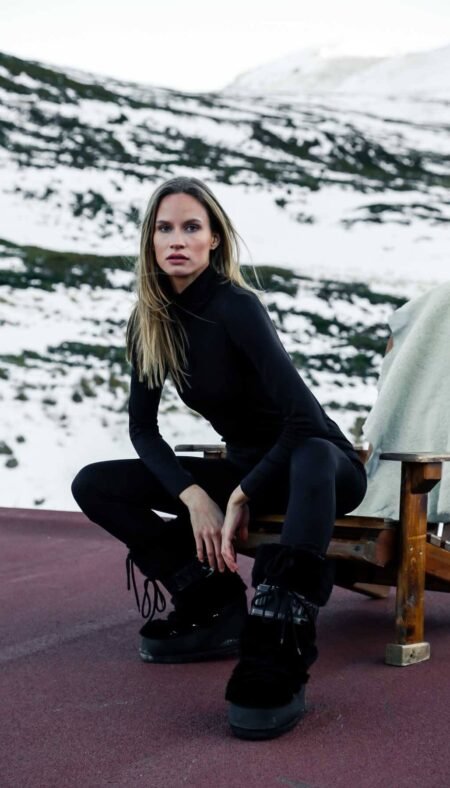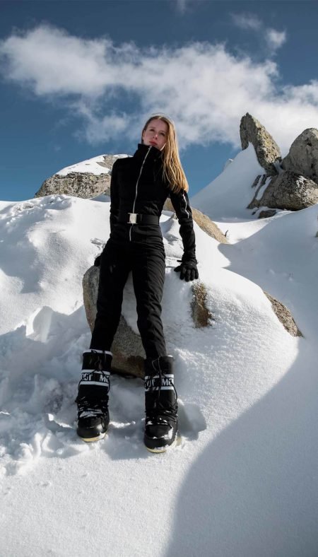- 34 % Off895.00 $Original price was: 895.00 $.595.00 $Current price is: 595.00 $.Designer ski jacket with stand-up collar, waterproof lining, metal zipper with waterproof cover, black. Black, waterproof covered metal zipper, metal logo button, designer ski trousers.