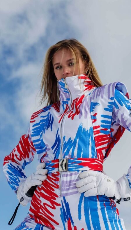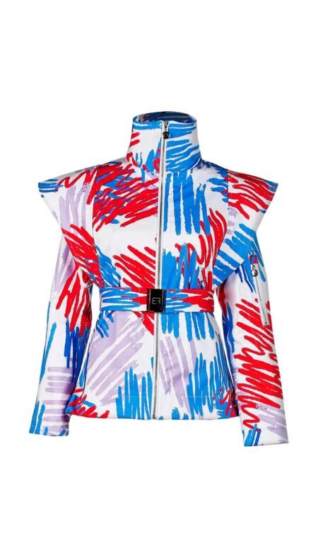 - 34 % Off895.00 $Original price was: 895.00 $.595.00 $Current price is: 595.00 $.Designer ski jacket with stand-up collar, waterproof lining, metal zipper with waterproof cover, blue red pattern. Blue red patterned, waterproof covered metal zipper, metal logo button, designer ski trousers.
