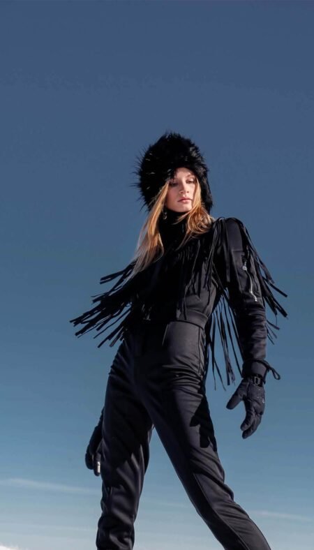 - 30 % Off995.00 $Original price was: 995.00 $.695.00 $Current price is: 695.00 $.Stand-up collar, waterproof covered metal zipper, design black tassel ski suit.