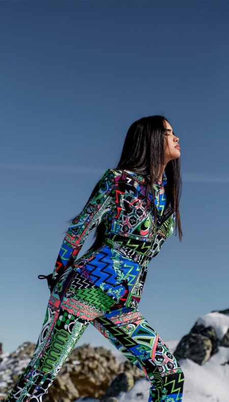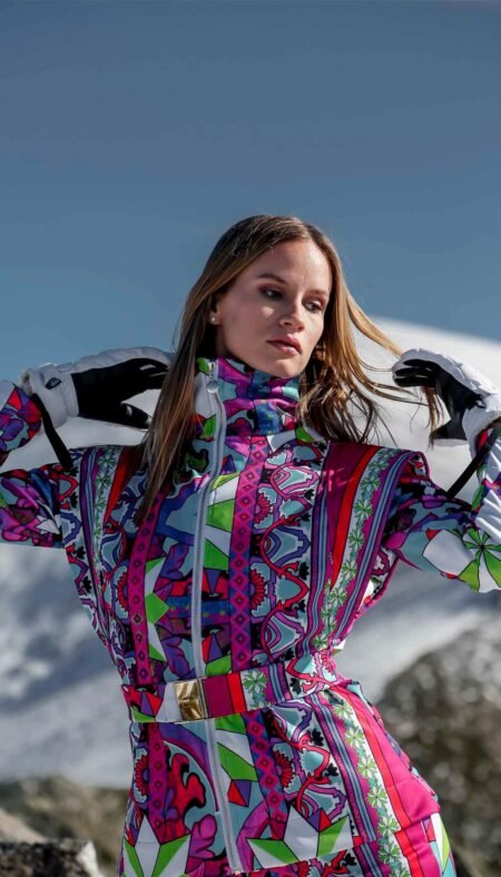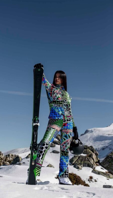 - 34 % Off895.00 $Original price was: 895.00 $.595.00 $Current price is: 595.00 $.Designer ski jacket with stand-up collar, waterproof lining, metal zipper with waterproof cover, blue green pattern. Blue green patterned, waterproof covered metal zipper, metal logo button, designer ski trousers.