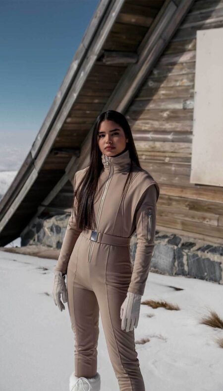 - 34 % Off895.00 $Original price was: 895.00 $.595.00 $Current price is: 595.00 $.Stand-up collar, waterproof covered metal zipper, design mink colored ski suit.