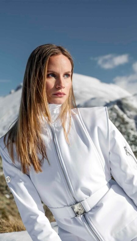 - 34 % Off895.00 $Original price was: 895.00 $.595.00 $Current price is: 595.00 $.Designer ski jacket with stand-up collar, waterproof lining, metal zipper with waterproof cover, white . White patterned, waterproof covered metal zipper, metal logo button, designer ski trousers.