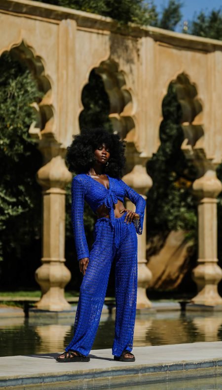 240.00 $Wear the exotic spirit of Marrakech with the Majorelle Trousers, the eye-catching piece of the ELA’F SS24 Soleil de Marrakech Collection. Majorelle Trousers, which fascinate with their sax blue color and dazzle with their knitted lace fabric, adapt to every style with their elegant flow and romantic atmosphere.