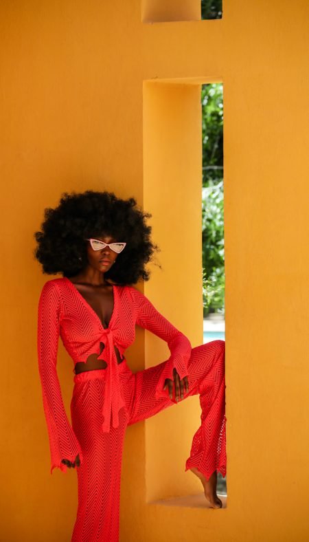 - 26 % Off500.00 $Original price was: 500.00 $.370.00 $Current price is: 370.00 $.Reflect the warm and passionate spirit of Marrakech to your style with the Amazigh Suit, the eye-catching piece of the ELA’F SS24 Soleil de Marrakech Collection. Combining the energy of red and the elegance of knitted lace fabric, the Amazigh Set helps you create a sophisticated and modern style with its long-sleeved front-tie crop and thin lace trousers.