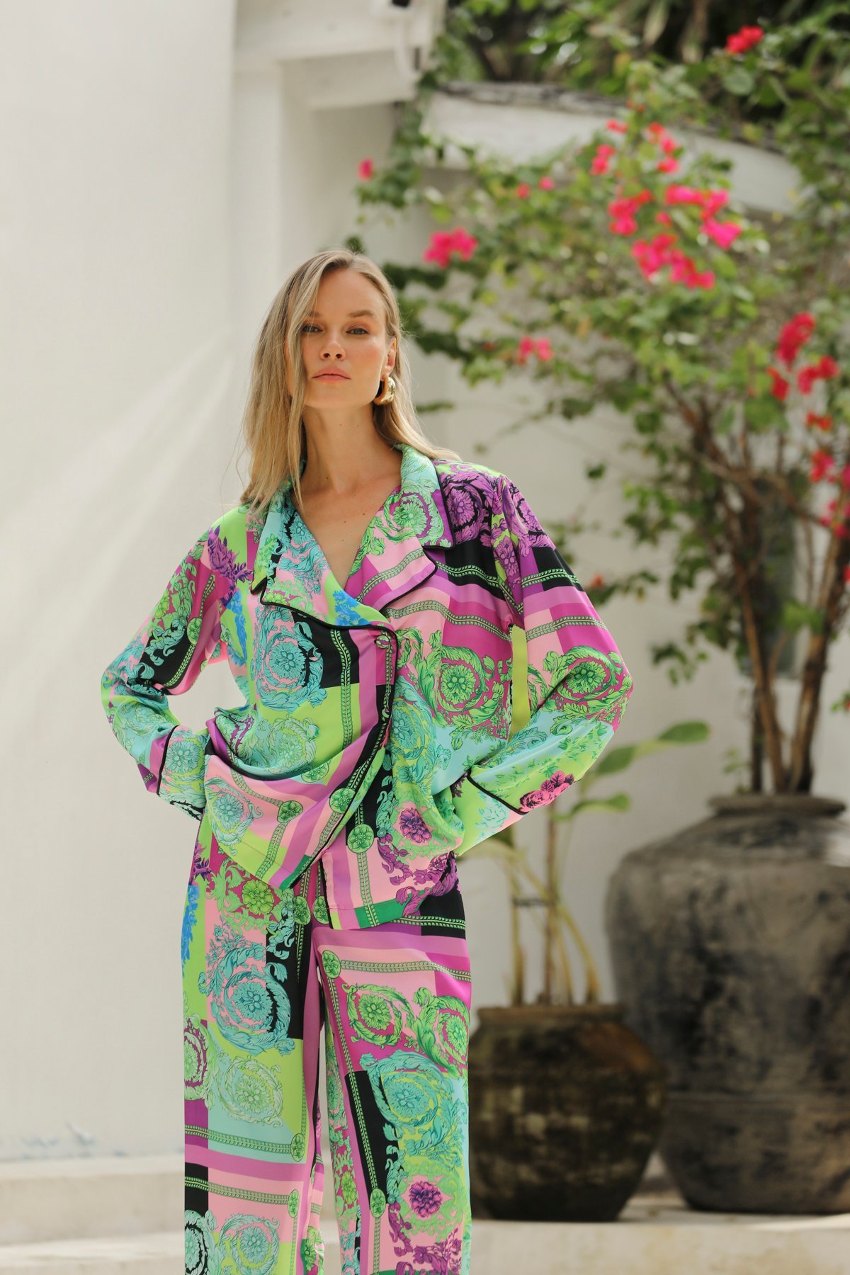 ANAIS DOUBLE-BREASTED TOP – SILK SATIN PURPLE PRINT