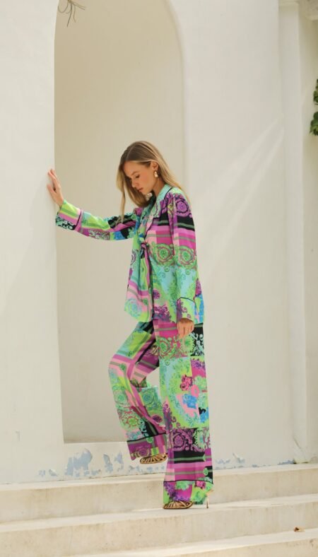 Crafted from silk satin with piped detailing and a refined double-breasted silhouette, it offers a breathable, soft texture that ensures all-day comfort.