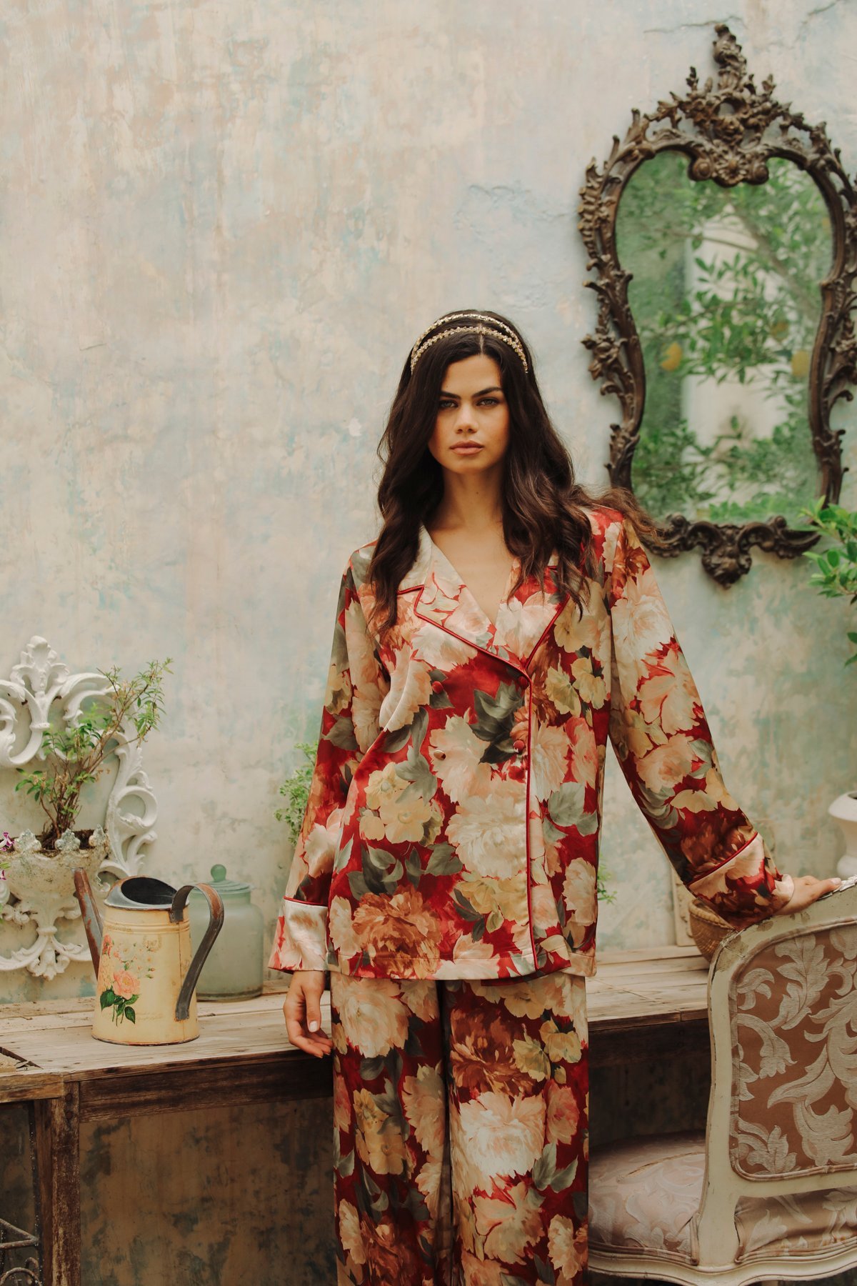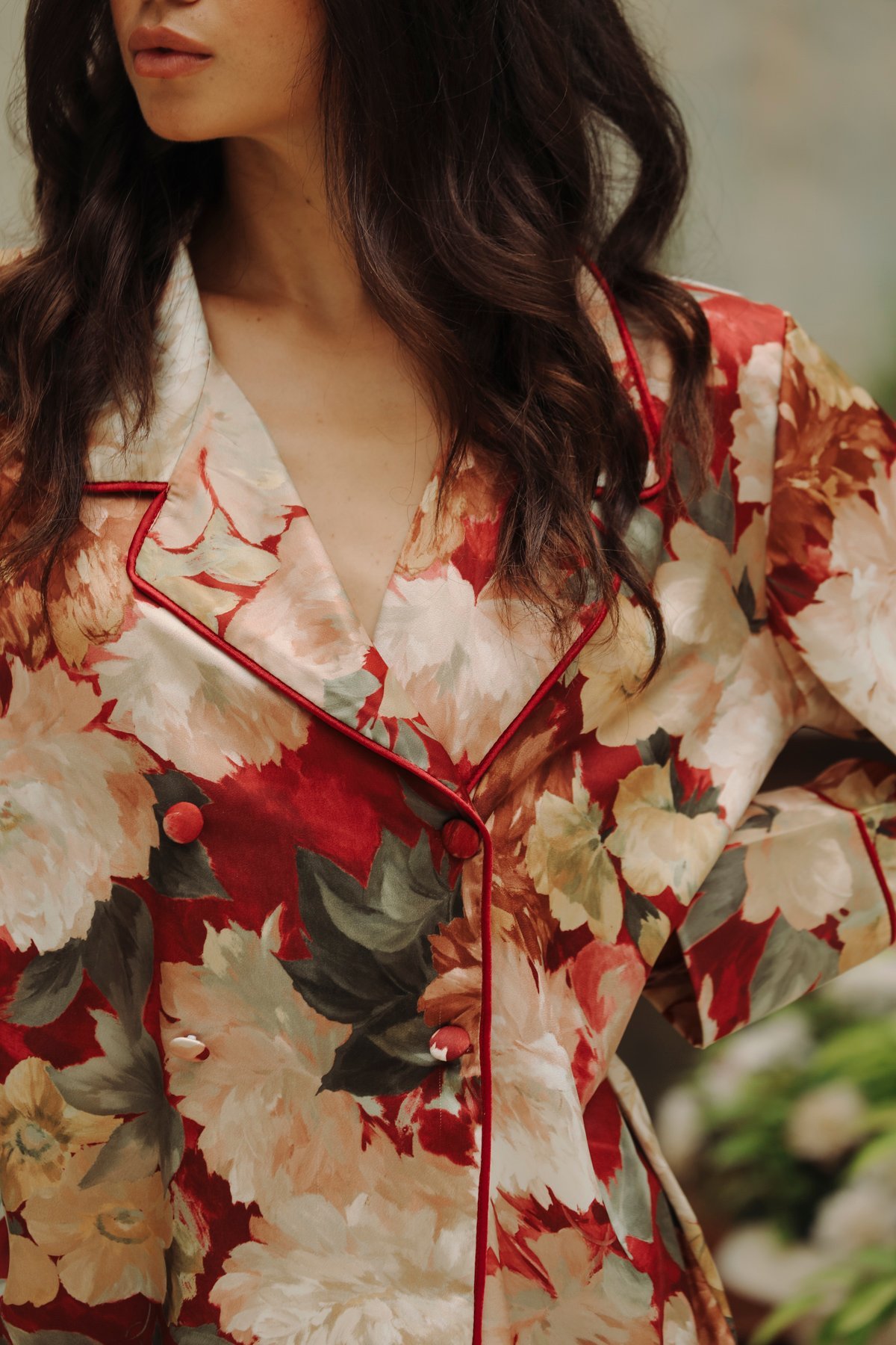 JARDIN SECRET PANT SET | SILK SATIN BURGUNDY FLORAL