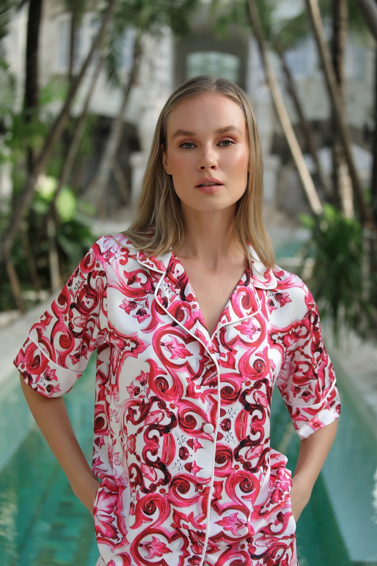 ROUGE ROYAL SHORT-SLEEVE SHIRT – SILK SATIN RED–WHITE PATTERN