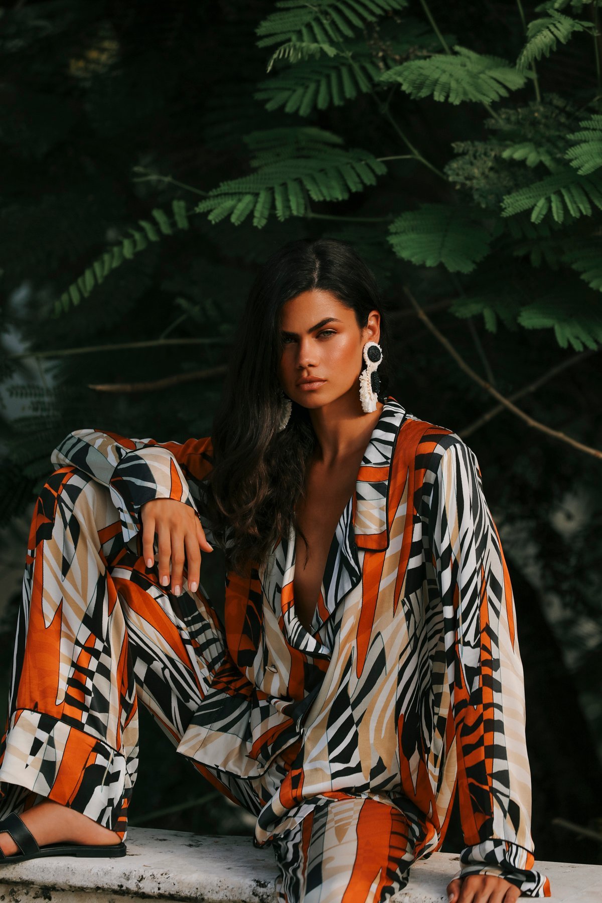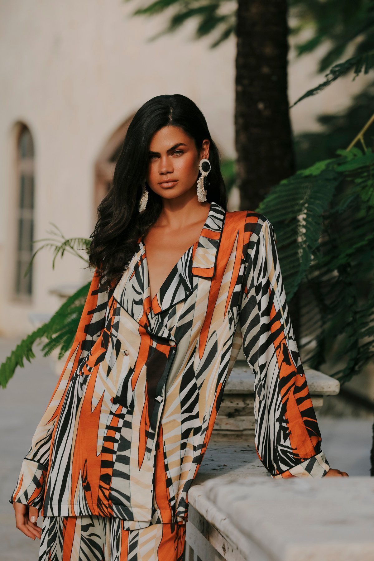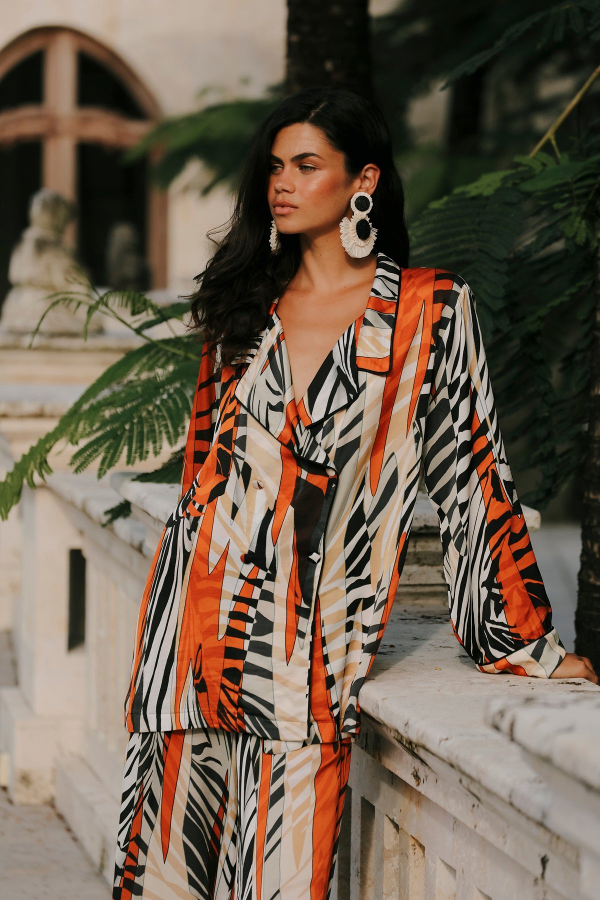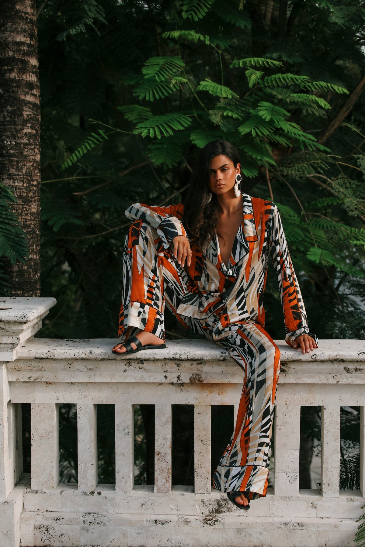 SAUVAGE PANT SET – SILK SATIN ORANGE–BLACK PATTERN