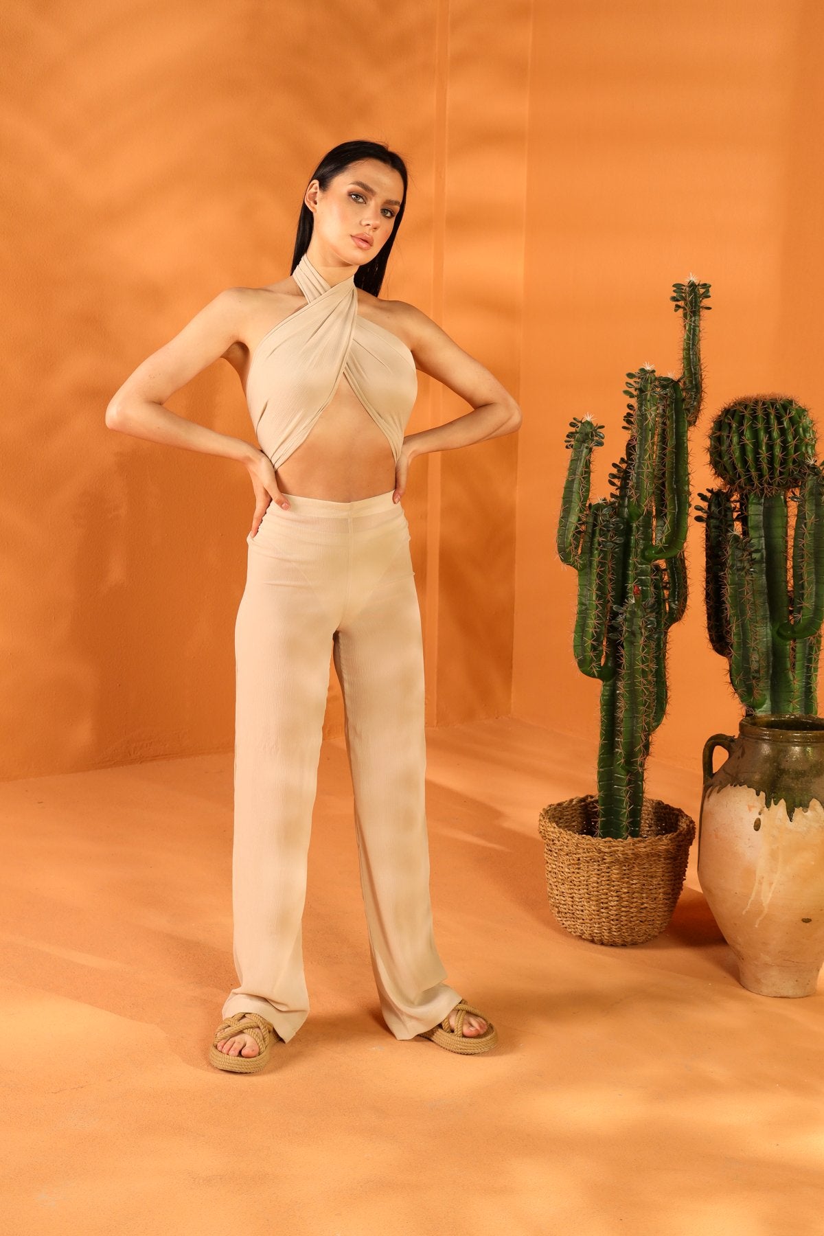 Weit geschnittene, nerzfarbene Hose. Größe: S. Hosenlänge: 115 cm. Maße des Models: Körpergröße: 173 cm – Brustumfang: 85 cm – Taillenumfang: 63 cm – Hüftumfang: 90 cm. Die Stoffdesigns stammen von einem italienischen Designer. Gefertigt aus hochwertigem Leinen. Sonderanfertigungen auf Anfrage.