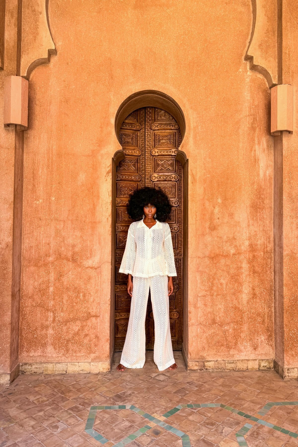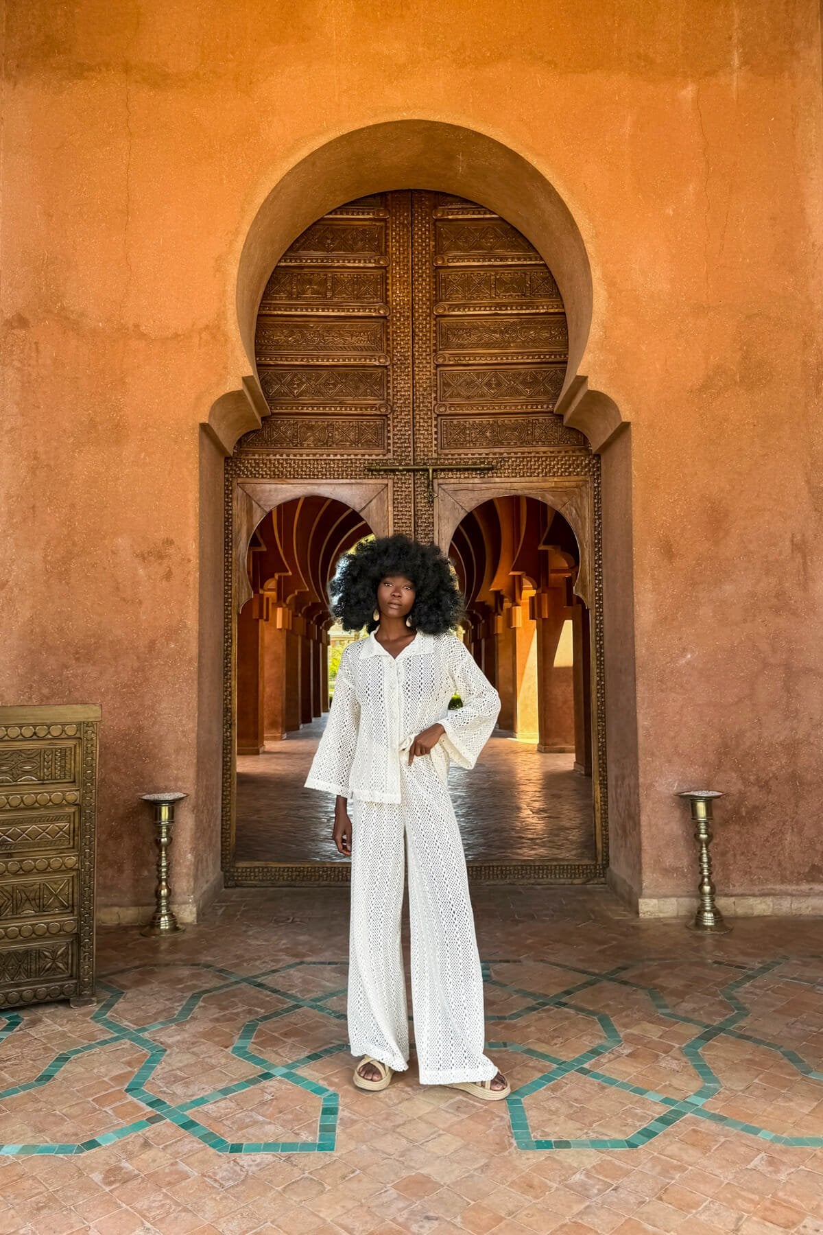 - Pieces: Fine 100% Cotton Knit Button-Detail Shirt Collar Top and Fine 100% Cotton Knit Wide-Leg Trousers