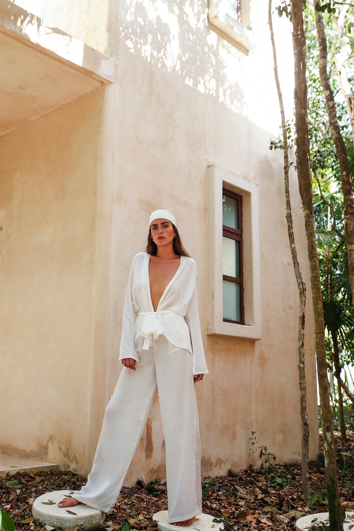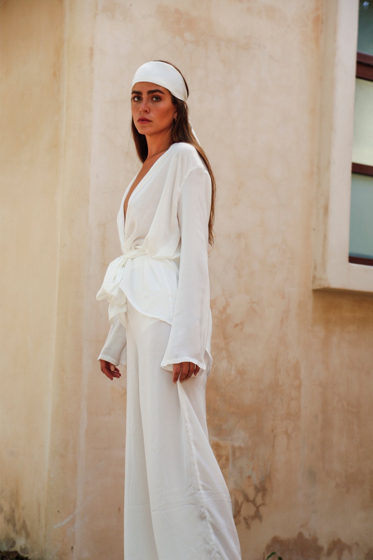PRODUCT FEATURES: White, trousers. Model's measurements: Height: 1.80m, Chest: 84cm, Waist: 62cm, Hips: 91cm. Belt is included with the product. FABRIC: 95% Silk, 5% Cotton