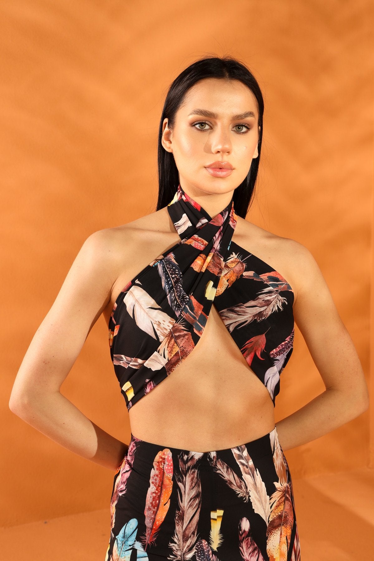 Feather-patterned, black shawl. Product Size: S / Model Measurements: Height: 173 cm - Bust: 85 cm - Waist: 63 cm - Hips: 90 cm. Fabric designs are by an Italian designer. Made from high-quality Cupro fabric using a special process. Contact us for custom orders.