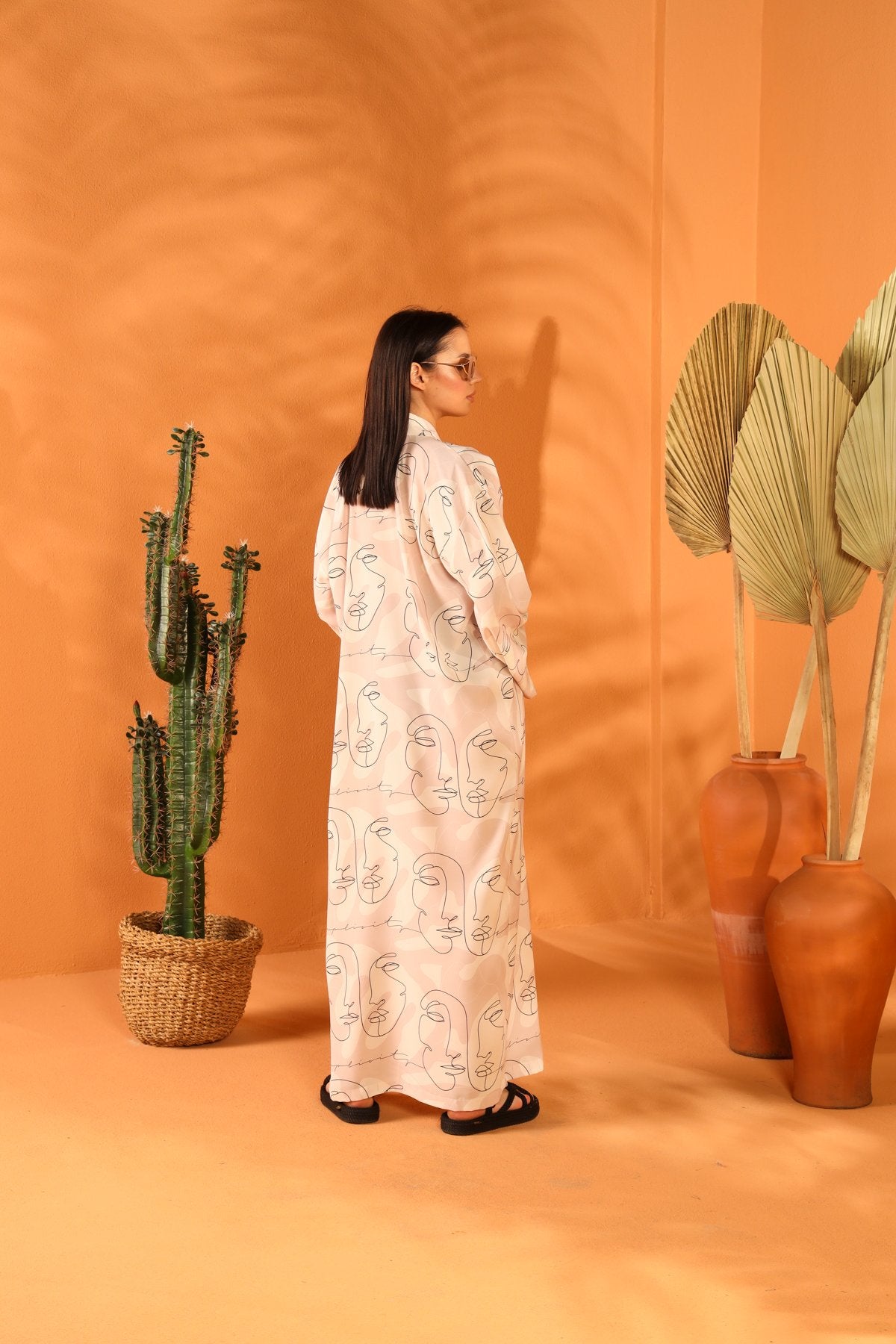 V-neck, patterned, pink, belted long kimono. Product Size: S. Kimono Length: 140 cm. Model Measurements: Height: 173 cm - Bust: 85 cm - Waist: 63 cm - Hips: 90 cm. Fabric designs are by an Italian designer. Made from high-quality Cupro fabric using a special process. Contact us for custom orders.