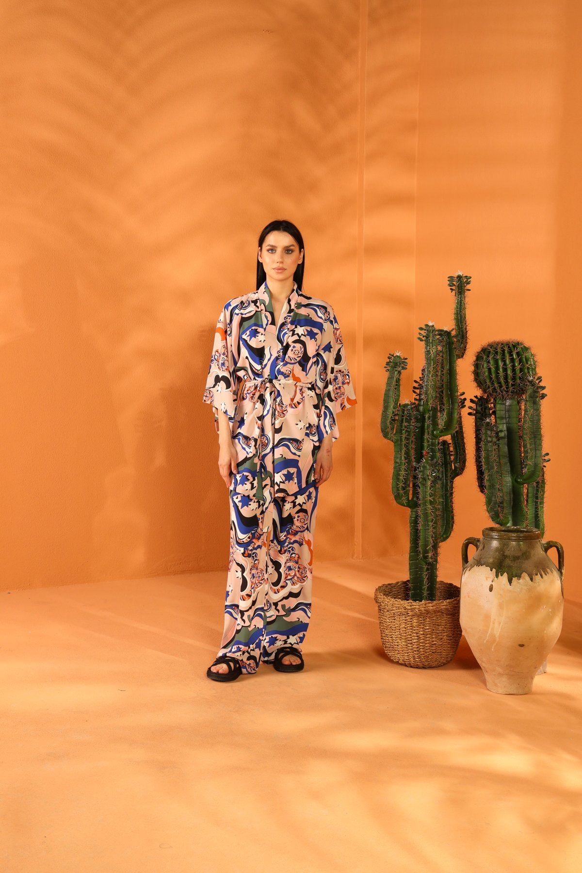 Wide-leg, star-patterned, colorful trousers. Product Size: S. Trouser Length: 115 cm. Model Measurements: Height: 173 cm - Bust: 85 cm - Waist: 63 cm - Hips: 90 cm. Fabric designs are by an Italian designer. Made from high-quality Cupro fabric using a special process. Contact us for custom orders.