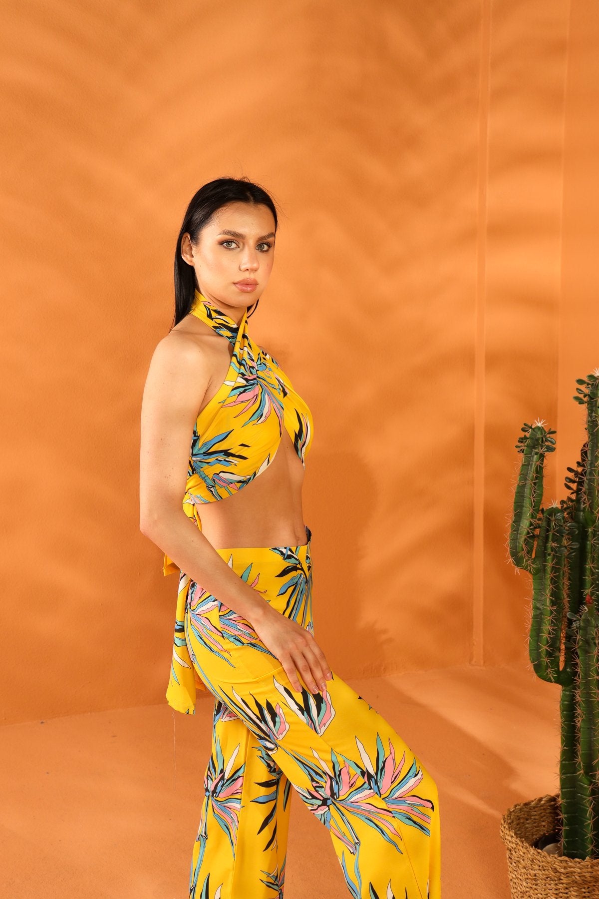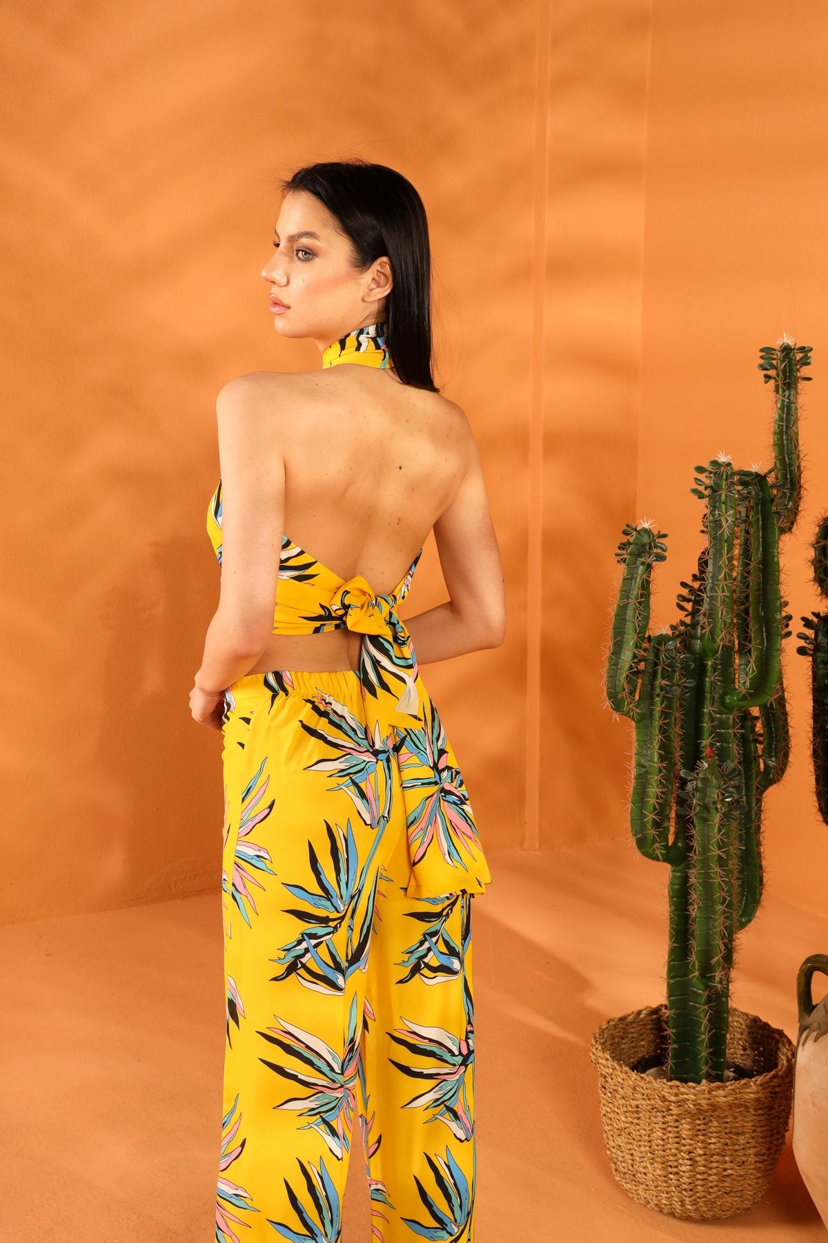 Wide-leg, fine leaf pattern, yellow trousers. Product Size: S. Trouser Length: 115 cm. Model Measurements: Height: 173 cm - Bust: 85 cm - Waist: 63 cm - Hips: 90 cm. Fabric designs are by an Italian designer. Made from high-quality Cupro fabric using a special process. Contact us for custom orders.