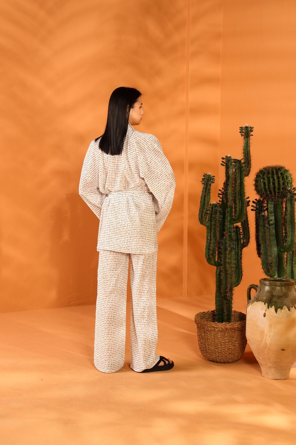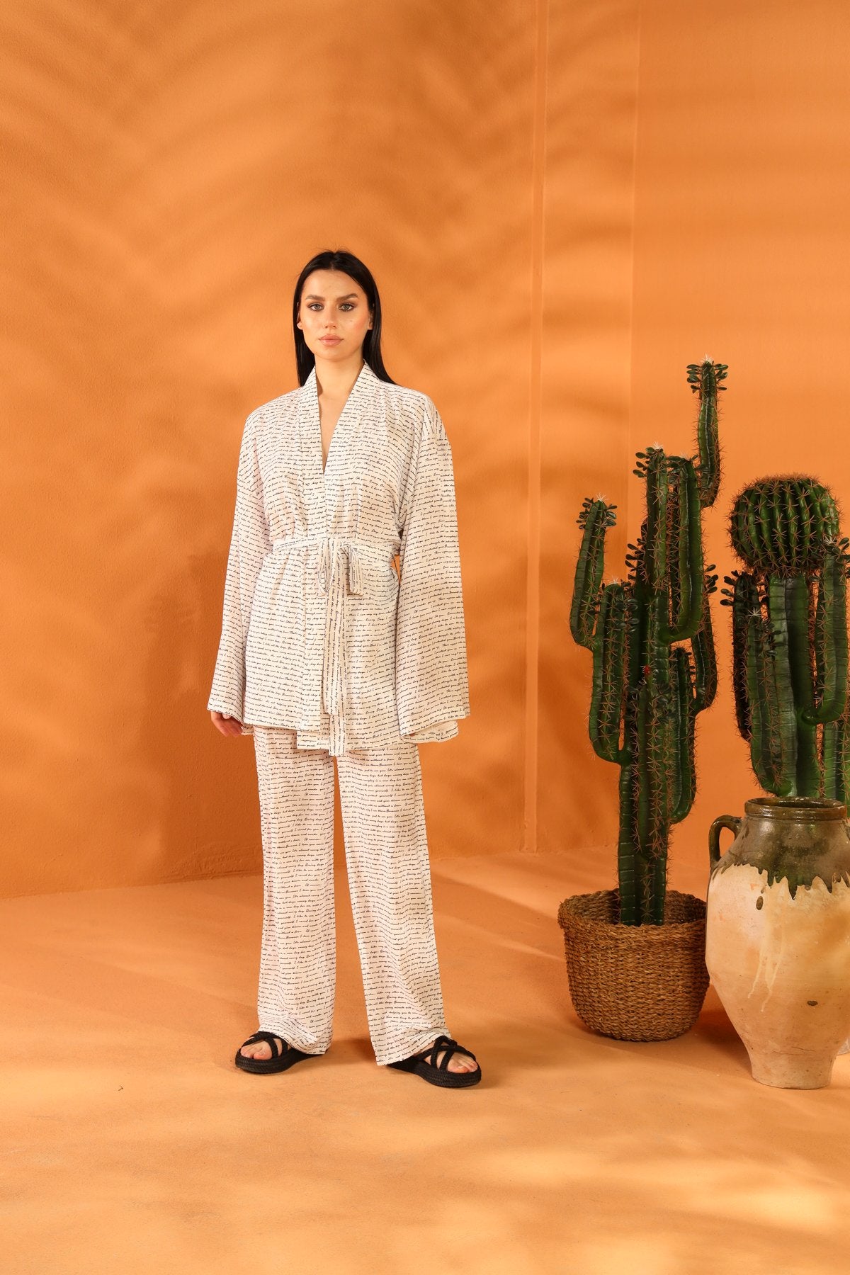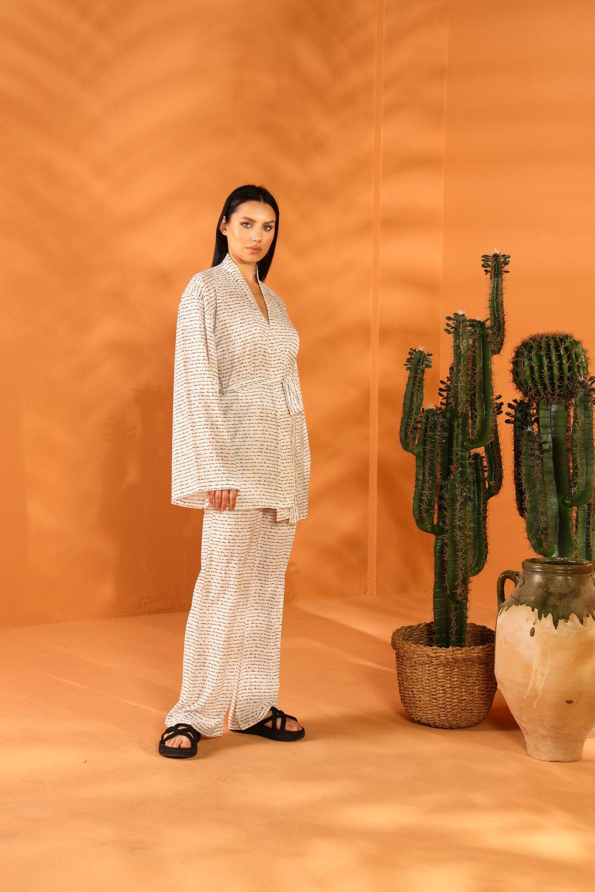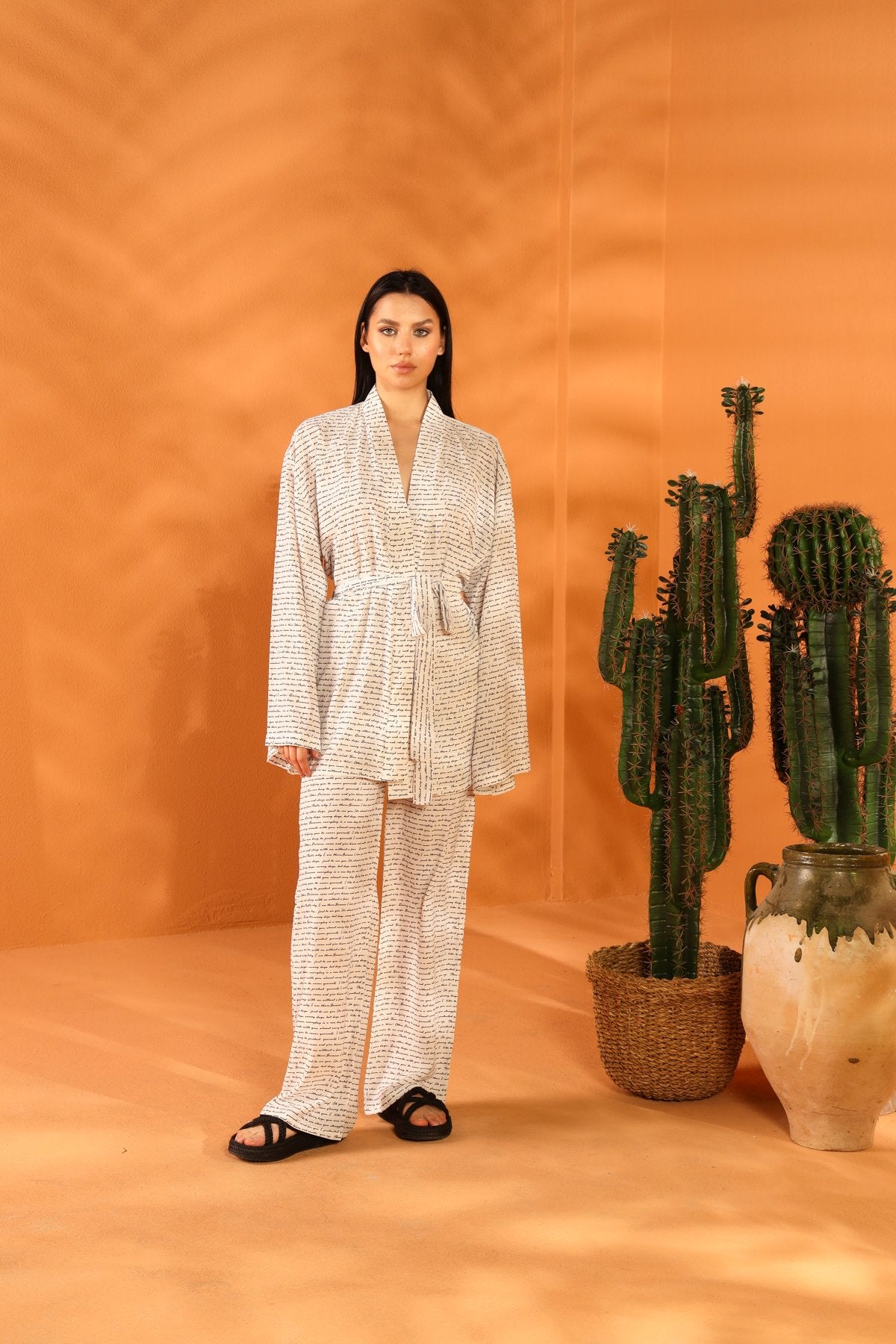 Yazılı, beyaz, takım Ürün Bedeni: S / Model Ölçüsü Boy: 173 cm - Göğüs: 85 cm - Bel: 63 cm - Kalça: 90 cm Kumaş tasarımları İtalyan tasarımcıya aittir. Yüksek kalite Cupro kumaş özel bir işlemden geçirilerek üretilmiştir. Özel dikim için iletişime geçebilirsiniz.