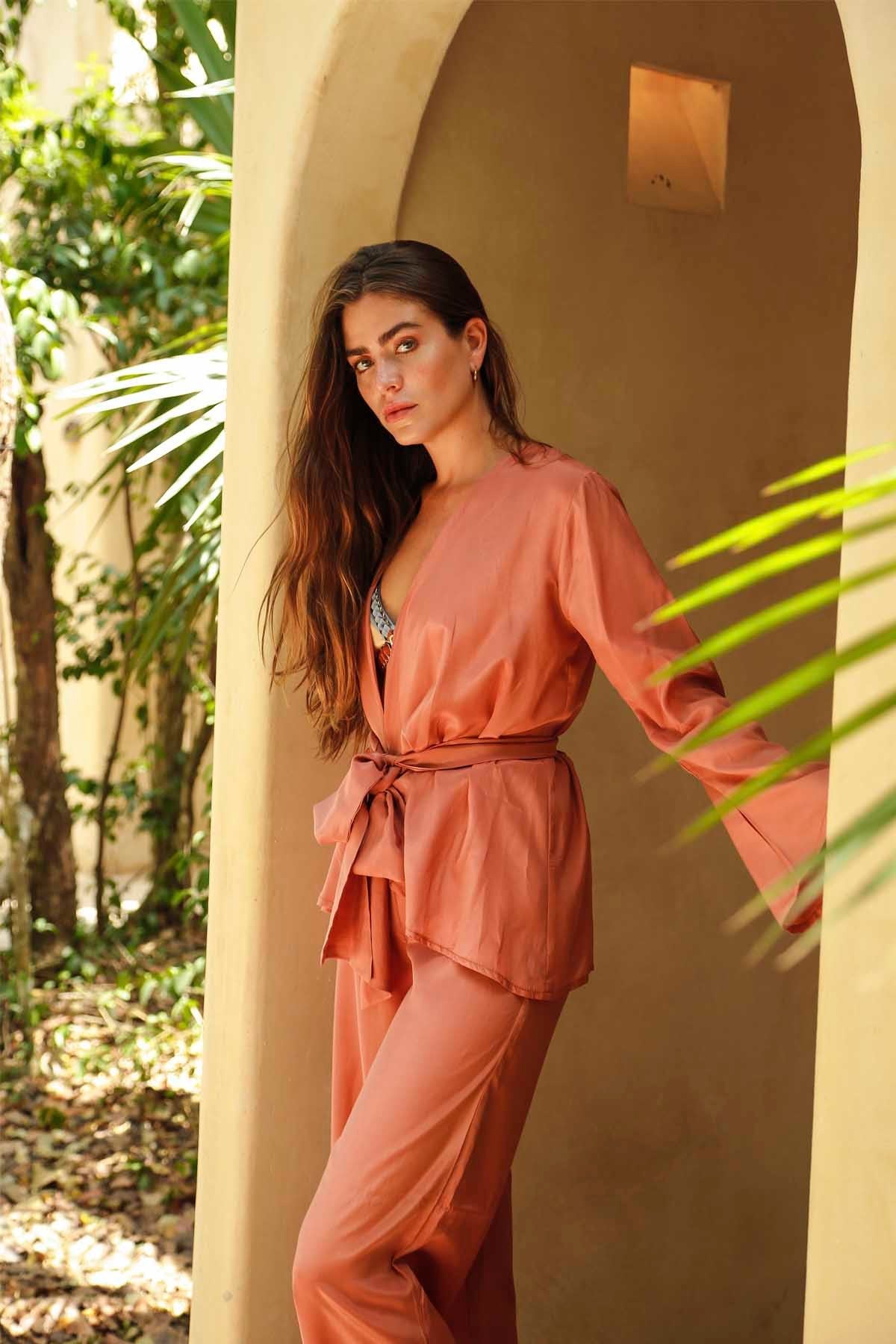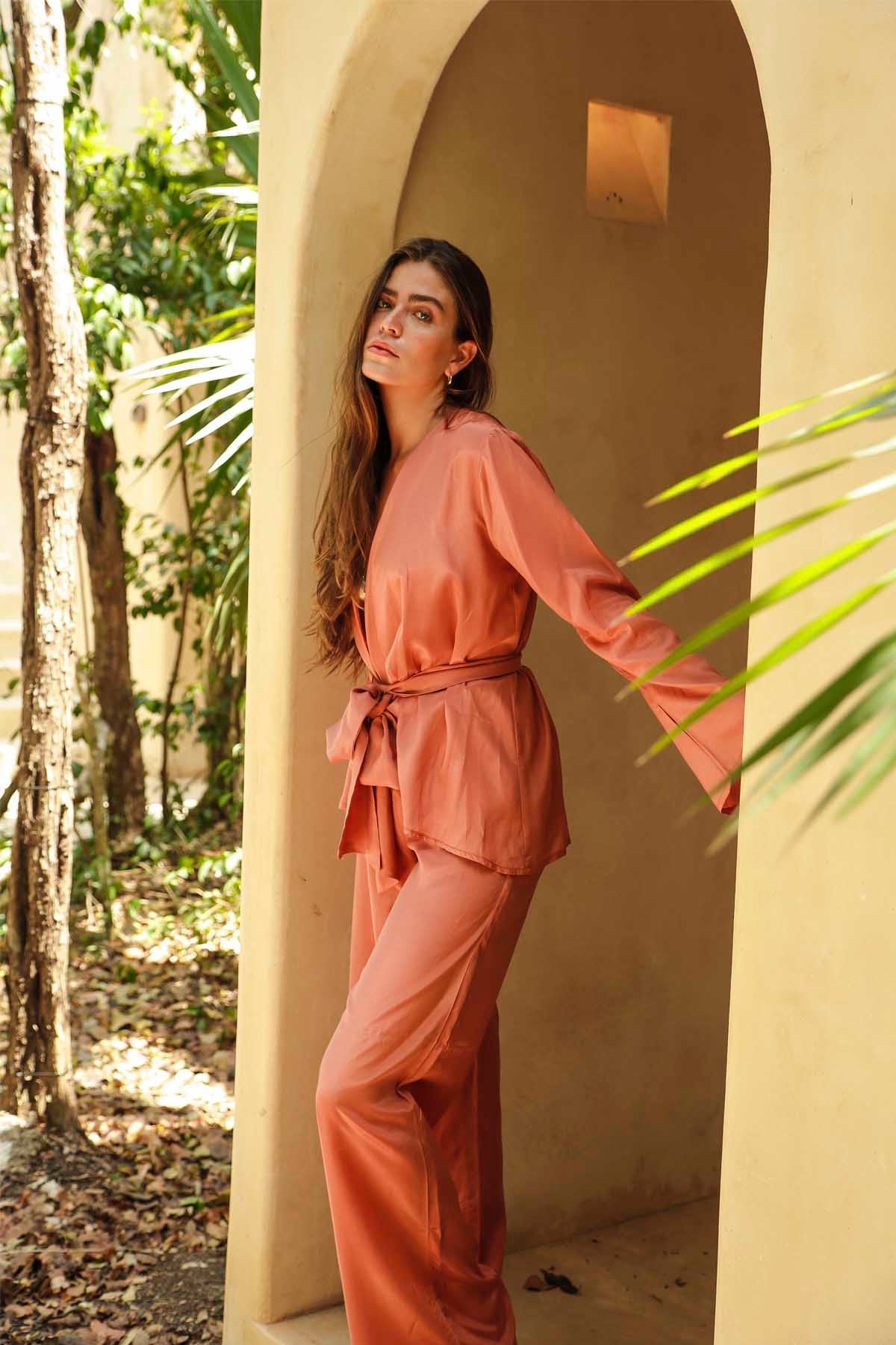 ÜRÜN ÖZELLİKLERİ: Koyu somon , pantolon üst takım Modelin ölçüsü : Boy :1.80 Göğüs:84 Bel:62 Basen:92 Kemer ürün ile birlikte gönderilmektedir. KUMAŞ: Yüksek kalite pamuk saten kumaş özel bir işlemden geçirilerek üretilmiştir.