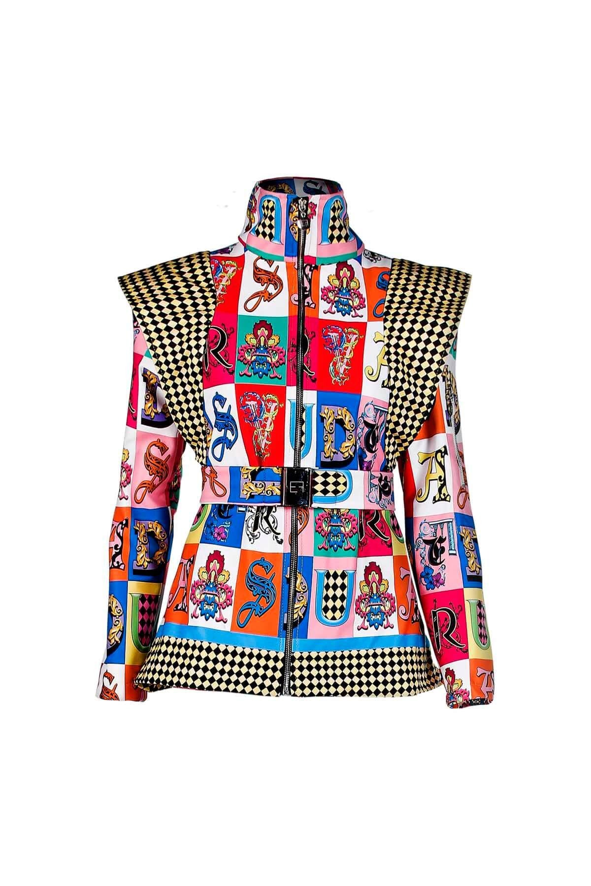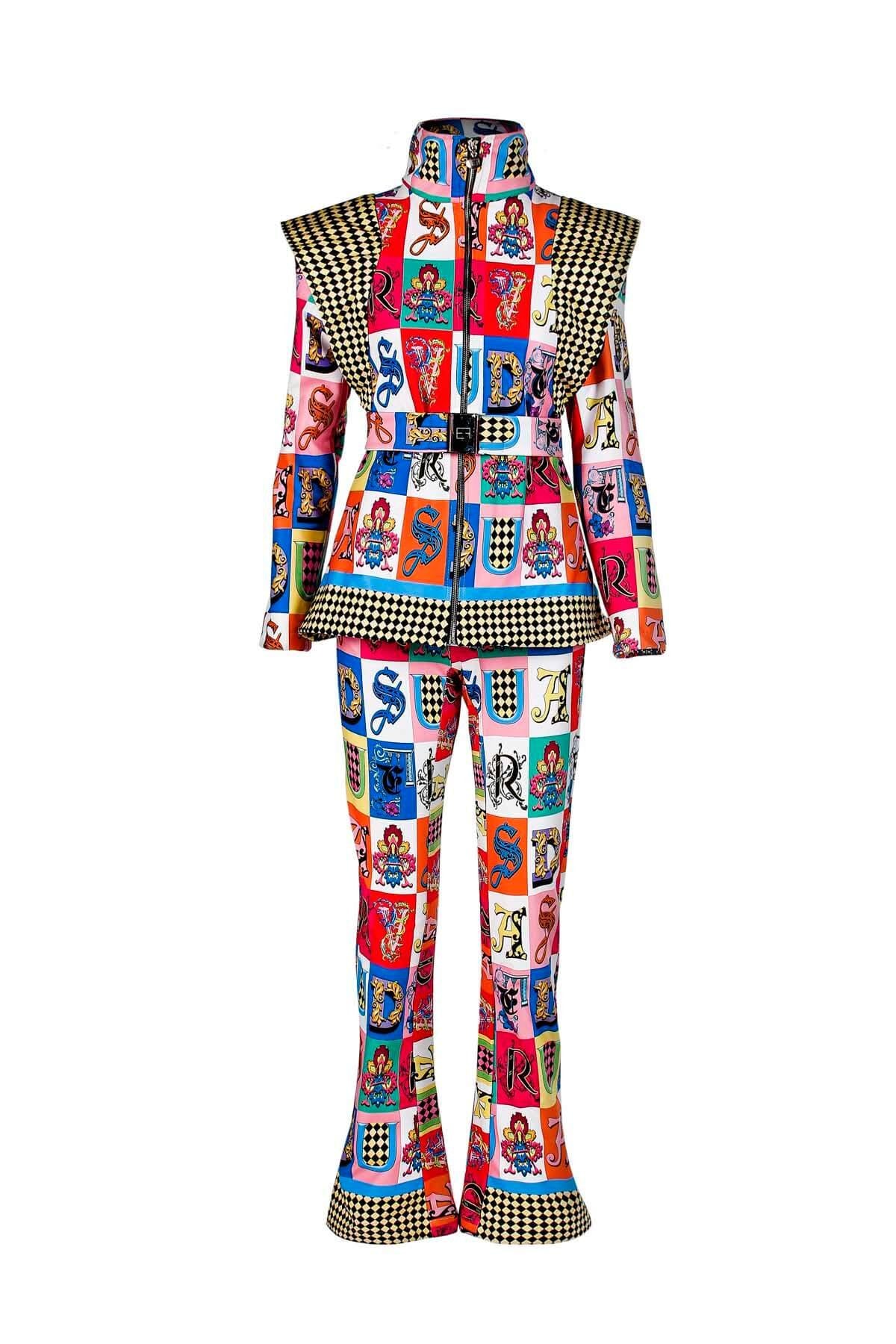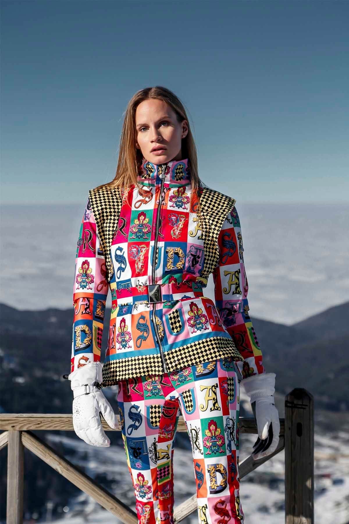Dik yaka , su geçirmez astar , su geçirmez üstü örtülü metal fermuar , harf desenli , tasarım kayak montu. Harf desenli , su geçirmez üstü örtülü metal fermuar , metal logo düğmeli , tasarım kayak pantolonu
